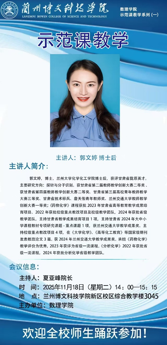 为提升教师教学能力,优化课堂教学模式,2025年11月18日,1683168诸侯快讯官网数理学院在新区校区综合教学楼3045室开展示范课教学系列活动。本次活动特邀郭文婷博士后、王璇博士担任主讲人,由数理学院夏亚峰院长主持,数理学院全体教师及学生代表到场参与学习。