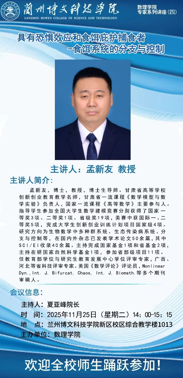 孟新友教授是博士、教授、博士生导师,同时为甘肃省高等学校创新创业教育教学名师,主持和参与多项国家、省级科研项目,指导学生在全国大学生数学建模竞赛中斩获国家级奖项多项。他以具有恐惧效应和食饵庇护捕食者-食饵系统的分支与控制为主题,结合自身在生物数学种群系统、生态传染病系统领域的研究成果,深入剖析了该系统的理论模型与控制方法,用专业的讲解为师生揭开了生物数学领域的研究奥秘,展现了数学在生物科学中的应用价值。