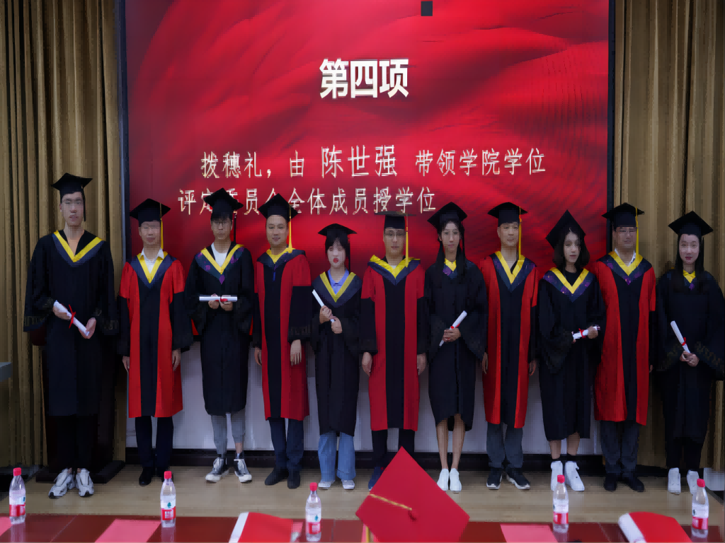 随后,进行的是一项重要的仪式——拨穗礼,由学院学位评定委员会主席陈世强带领学院学位评定委员会成员为毕业生授予学位并进行拨穗礼。拨穗寓意稻穗的成熟,代表毕业生们的学有所成,他们将满载老师的期许与鼓励,在今后的人生展翅高飞。