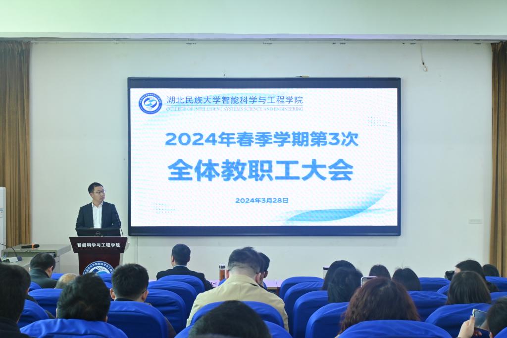 3月28日上午,我院在集成楼213学术报告厅举行2024年春季学期第3次全体教职工大会,学院党委书记孙先波主持会议。执行院长陈世强、院长秦柳、党委副书记汪涛、副院长来国红、副院长钱楷、副院长向军及学院全体教职工参加会议。