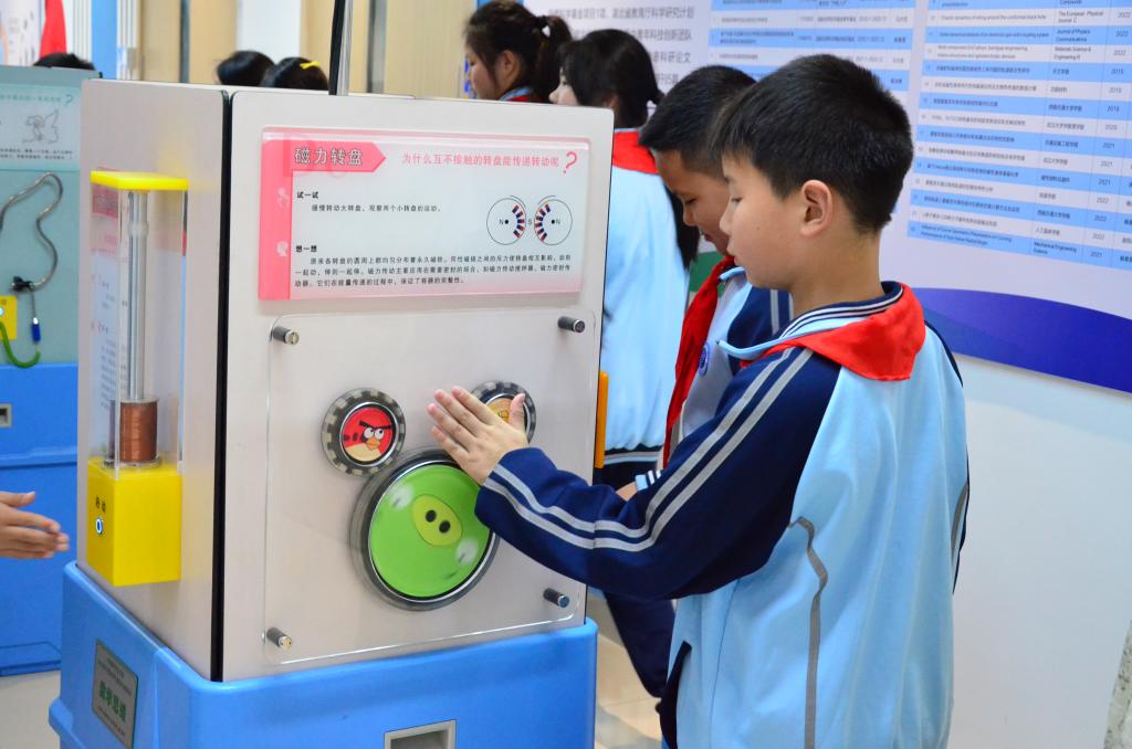 随后,每个小组成员在老师的引领下自行实验。现场氛围欢快与热烈。志愿者带领同学们通过物理器材体验了物理运动的各种情况,以及记忆金属等各种新材料。
