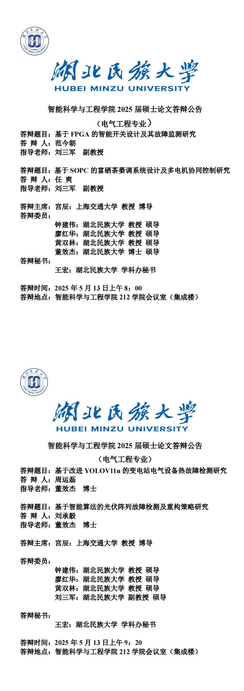 智能科学与工程学院2025届硕士学位论文答辩公告(二)