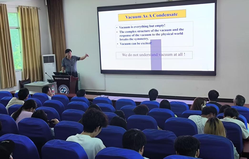 冯笙琴教授向师生们介绍了高能重离子碰撞实验、物质与反物质不对称之谜、暗能量与暗物质的寻找、什么是真空等前沿物理内容,并简要阐述了有限温度场理论和AdS/CFT等在高能重离子碰撞领域广泛应用的理论工具。这场报告开拓了在座师生的学术视野。同时冯教授分享了他在指导和培养研究生过程中的一些经验和体会,令在座师生深受启发。在互动交流环节,冯教授对学生们的提问进行了耐心解答,会场气氛十分热烈。