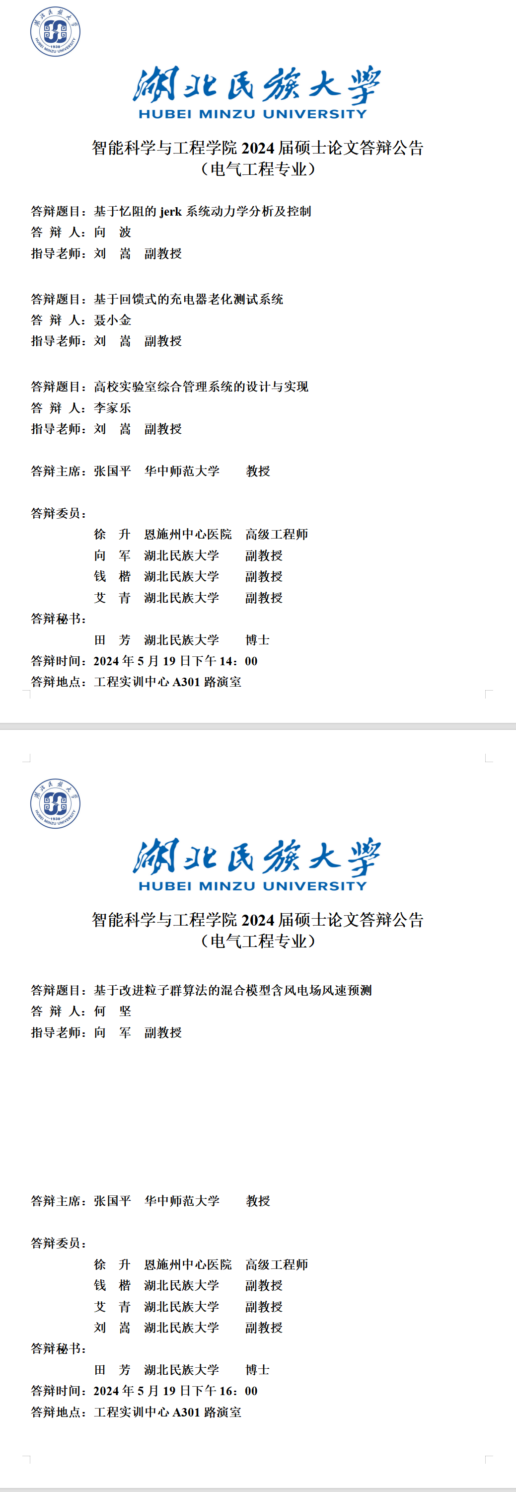 智能科学与工程学院2024届硕士学位论文答辩公告(一)