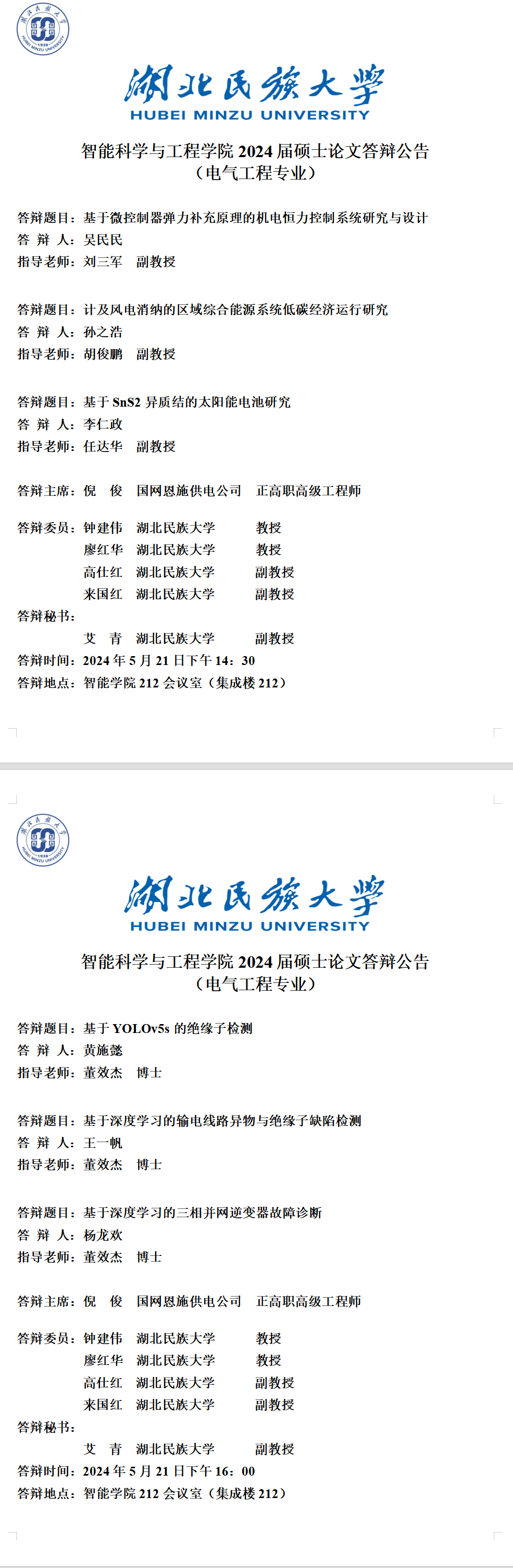 智能科学与工程学院2024届硕士学位论文答辩公告(五)