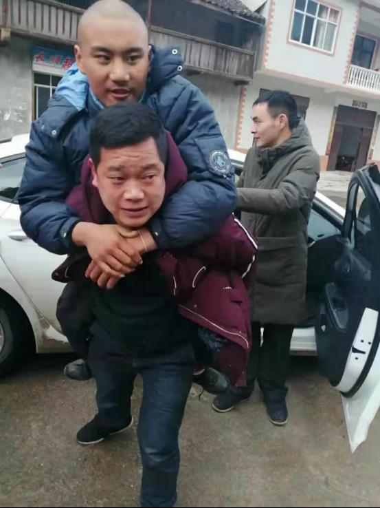 (谭森权背西流水村残疾儿童郑鑫奎参加送教下乡活动。)