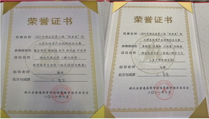 (通讯员 袁健栋)2021年6月16日,由湖北省普通高等学校体育教学指导委员会主办、湖北大学体育学院承办的“湖北省第二届创未来杯大学生体育产业创新创业大赛”的决赛在湖北大学举行,来自省10所高校的12个项目进行了最后的角逐。体育学院运动科学研究团队彭永老师指导的项目“薪火体育—体育高考生体能一站式培训与服务”、刘颖老师指导的项目“恩施小狮子飞飞儿童平衡车俱乐部”分别获得二等奖和三等奖。项目的负责人分别是2020级体教1班的学生鲁雅思和戴东明宇。该奖项是近年来体育学院学生在大学生创新创业比赛中获得的最高奖项,是体育学院大学生创新创业工作在省部级比赛上的重要突破。