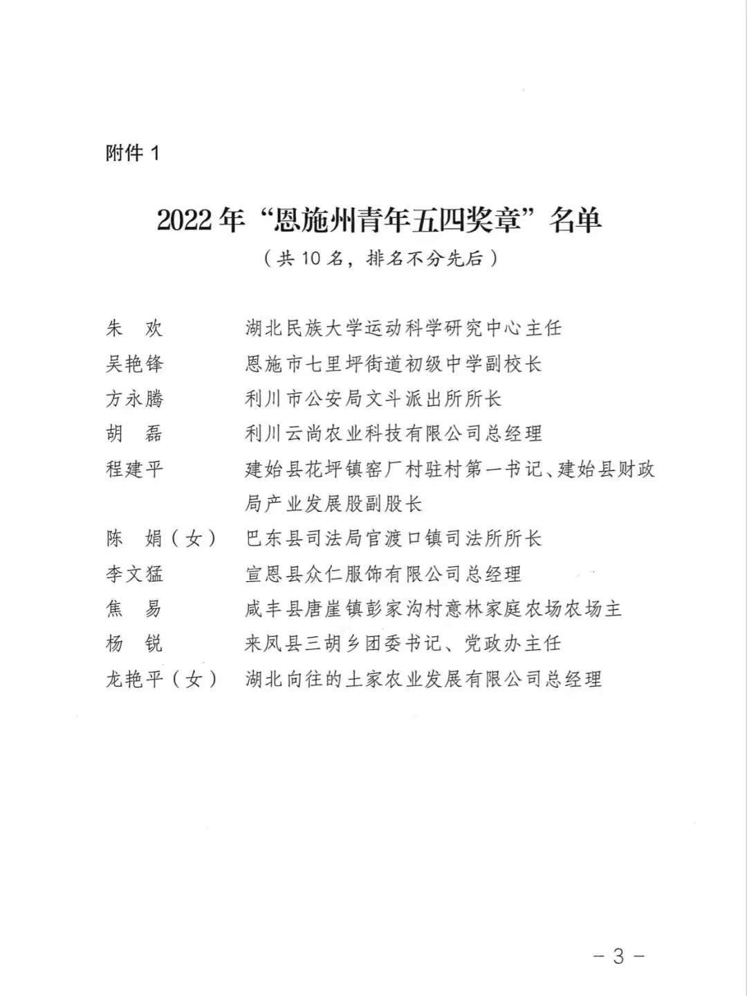 (通讯员 宋庆龙 张弋明)在2022年恩施州五四评优中,jinnian金年会体育学院教师朱欢获评“恩施州青年五四奖章”,jinnian金年会体育学院学生戴东明宇获评“恩施州优秀共青团员”荣誉称号。