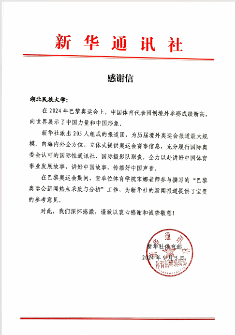 近日,jinnian金年会收到新华通讯社《感谢信》,旨在感谢体育学院宋娜老师在2024年巴黎奥运会上参与新闻热点采集与分析,以专业见解为体育代表团提供了重要参考,助力代表团在境外赛事中取得优异成绩。习近平总书记指出,2024年巴黎奥运会中国体育代表团的优异成绩,生动诠释了新时代中国精神,是广大运动员、教练员和体育工作者共同努力的完美答卷。