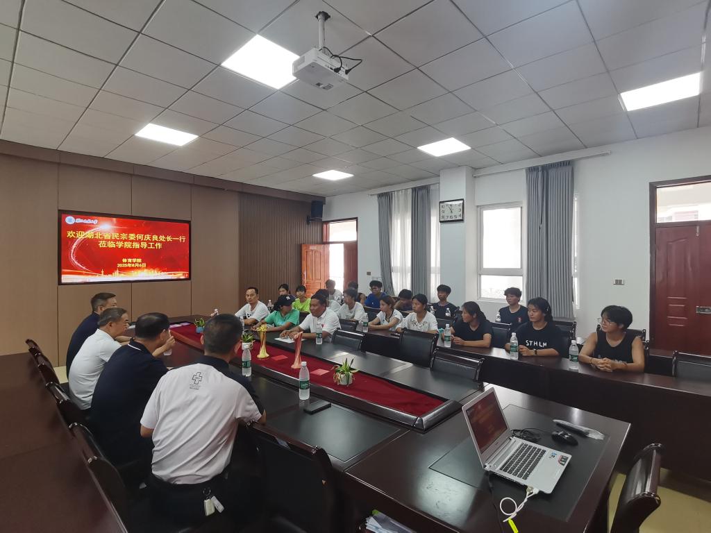 8月6日,湖北省民族宗教事务委员会何庆良处长、郭用德一级调研员一行莅临jinnian金年会体育学院,就高脚竞速训练基地建设工作进行调研指导,并慰问暑期集训运动员。学校党委常委、副校长李军,体育学院院长何斌、副院长胡庆华及基地教练员孙传清、陈芬、周一系陪同调研。
