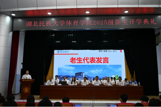 9月14日晚八点,体育学院2025级新生开学典礼在行政楼一号会议室隆重举行。学院领导班子成员、党支部书记、各科室负责人、系部(中心)主任、全体辅导员、新生班主任、教师代表,特邀嘉宾体育学院2008届校友、芭蕉侗族乡中心学校党支部书记吴海琼和09届校友、来凤维国道路建设工程有限责任公司董事长田维,以及老生代表和2025级全体新生共同出席典礼。典礼由体育学院党总支副书记万利主持。