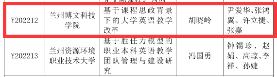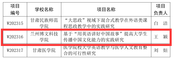 近日,甘肃省教育厅下发了《甘肃省教育厅关于公布2023 年度高等学校英语教学改革研究项目立项名单的通知》(甘教高函〔2023〕17号)和《甘肃省教育厅关于公布2021、2022年度高等学校英语教学改革项目结项名单的通知》文件(甘教高函〔2023〕16号),我校申报的两个项目获批立项,两个项目顺利结项。