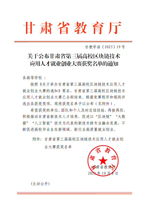 近日,甘肃省教育厅发布了《关于公布甘肃省第三届高校区块链技术应用人才就业创业大赛获奖名单的通知》(甘教学函〔2023〕19号),由我校经济与信息管理学院院长张利带队指导的队伍荣获本届竞赛就业项目赛道(本科组)二等奖和三等奖各一项。