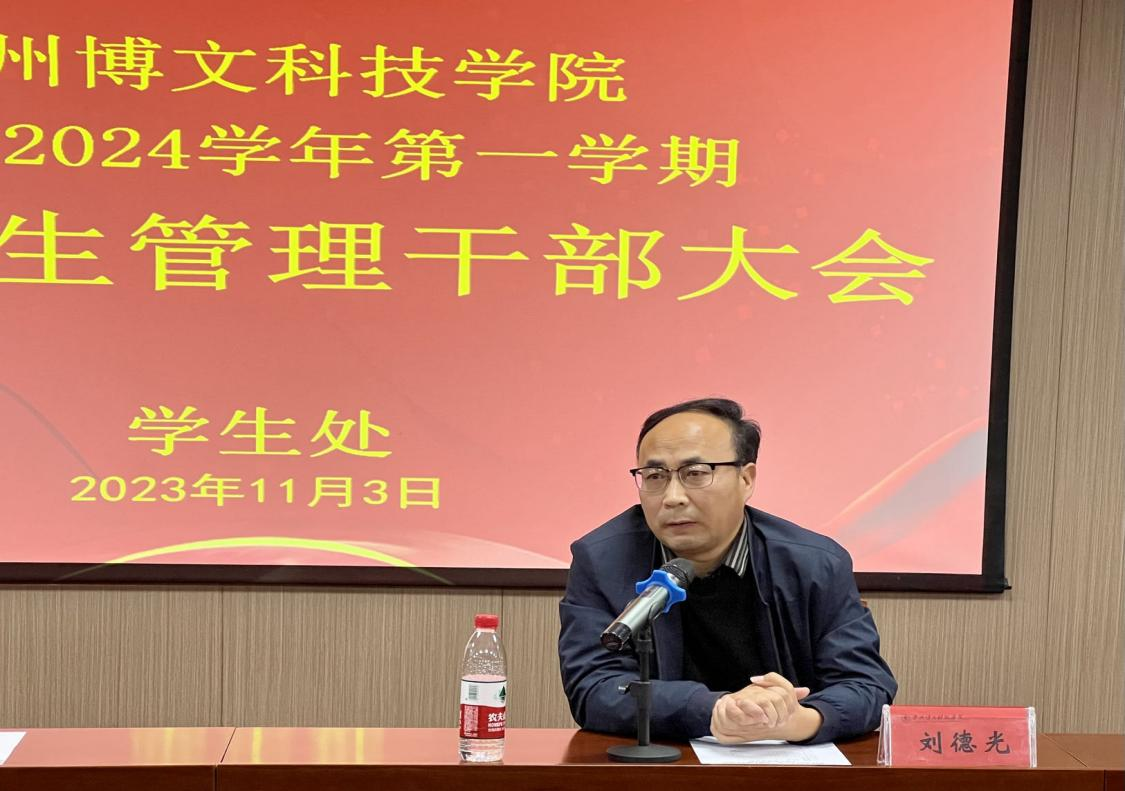 随后,刘德光在听取学生处的汇报和工作部署后,充分肯定了学生管理干部队伍的各项工作,感谢各个学院一直以来的辛勤工作。同时提出学生管理工作一要提高思想认识,强化责任担当;二要顶层设计,统筹规划,有序开展;三要严格学生工作纪律,改进作风,狠抓落实;四要健全学生管理制度,精进各项工作流程。他讲到学生工作看似纷繁复杂,涉及方方面面,但从系统的角度来看,仍然是一个整体。在具体工作中要抓住学生工作的规则要点,有针对性地制定工作计划和措施,提高工作效率。