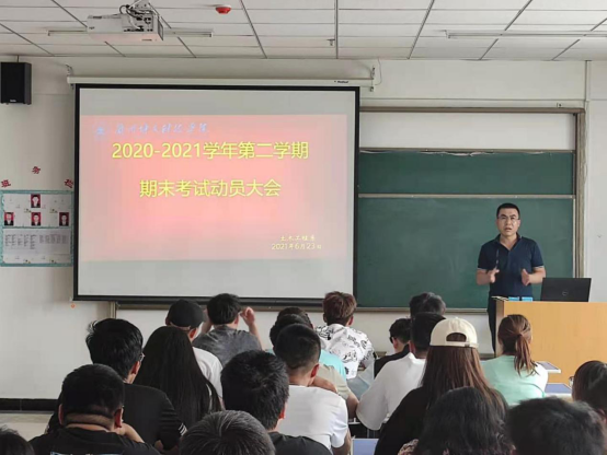 为严肃考风考纪,督促学生认真对待考试。土木工程系于2021年6月23日16:30在综1005室召开了以“期末考试”为主题的考前动员大会。本次大会由教学副主任叶国仁主持,参加本次大会的有班长、学习委员以及各班学生代表。
