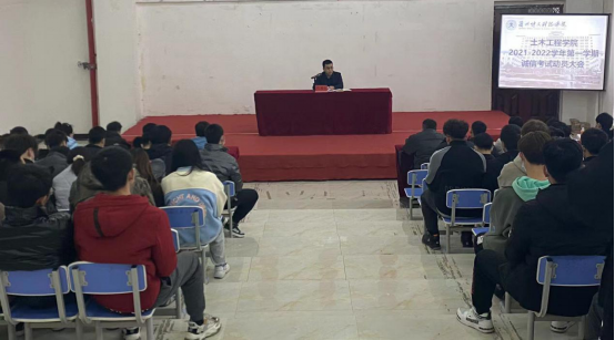 为了加强学风建设,严肃考纪考风,确保教育教学质量,土木工程学院于2021年12月10日16:30在综合楼12楼阶梯会议室召开期末诚信考试动员大会,本次会议由土木工程学院教学副院长叶国仁主持,土木工程学院全体学生参加。