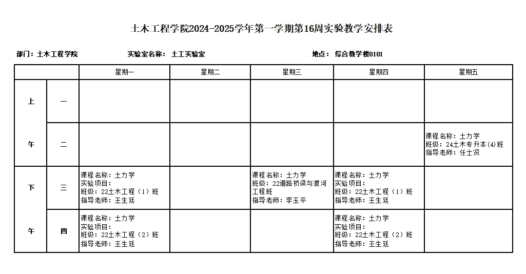 土木工程学院2024-2025学年第一学期第16周实验教学安排表