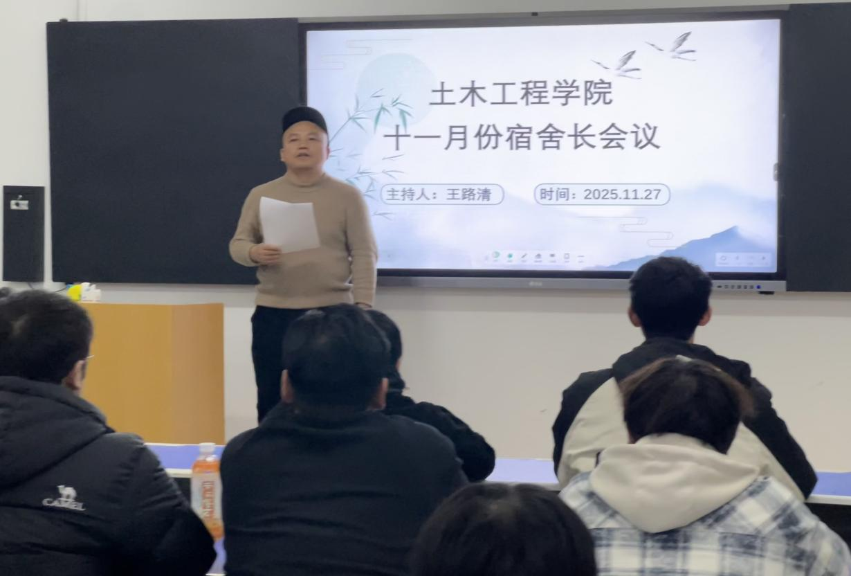 2025年11月27日19:30,为切实保障学生公寓安全,强化家校协同育人效果,土木工程学院于综合楼1010教室组织召开以“家校联动,筑牢公寓安全防线”为主题的宿舍长会议。此次会议由辅导员王路清老师主持,采取家校联动的形式,线上线下同时展开,学生家长线上参加,土木工程学院全体宿舍长线下参加。