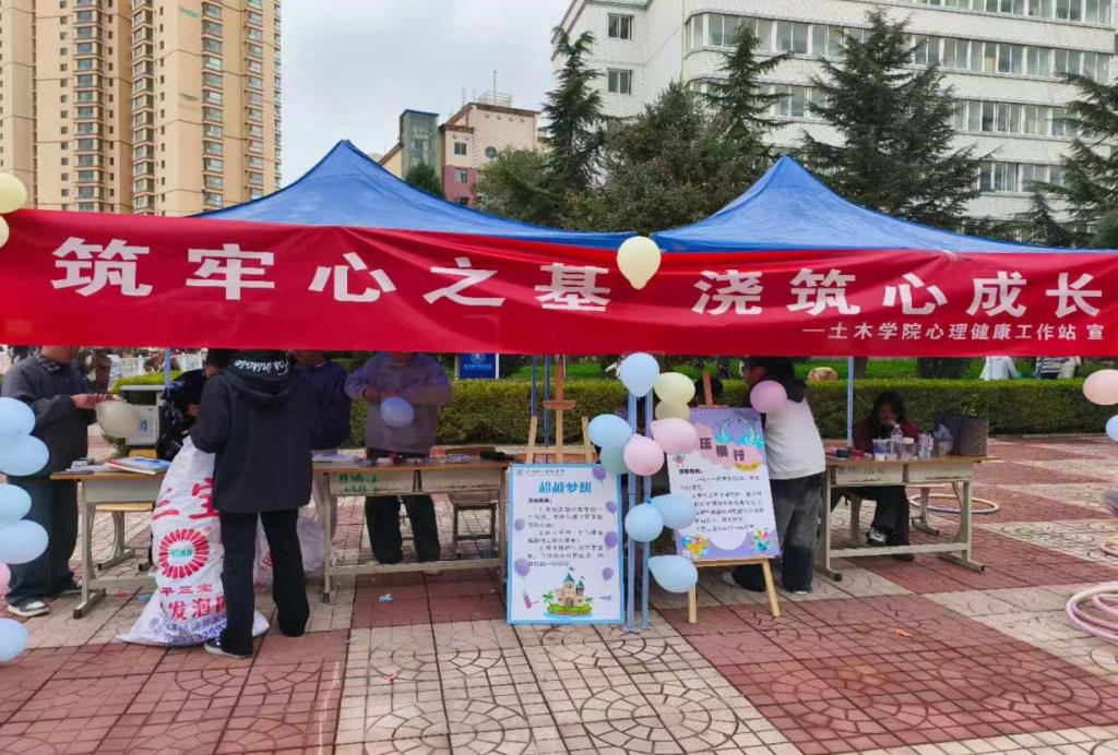 活动当天,土木工程学院成员早早抵达活动现场,开启前期筹备工作。现场分工明确、协作高效,有的搭建蓝色帐篷,确保活动摊位稳固;有的吹起缤纷气球,将现场装点得活力满满;有的摆放游戏道具、张贴主题海报,将活动核心标语“筑牢心之基,浇筑心成长”清晰呈现。