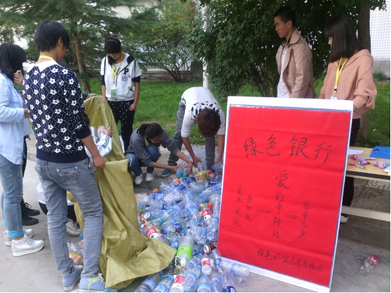 2014年9月25日至26日,兰州交通大学博文学院绿色环保志愿者协会在兰州交通大学博文学院校内举办了“绿色银行”活动。本社团约有五十名成员参与。该活动一共分为两个部分,第一个部分是对下课回宿舍的同学进行环保再利用及公益宣传,第二个部分是进入宿舍回收废弃饮料瓶。活动一共进行了约一个半小时,该活动对资源的回收再利用起到了很好的宣传作用。