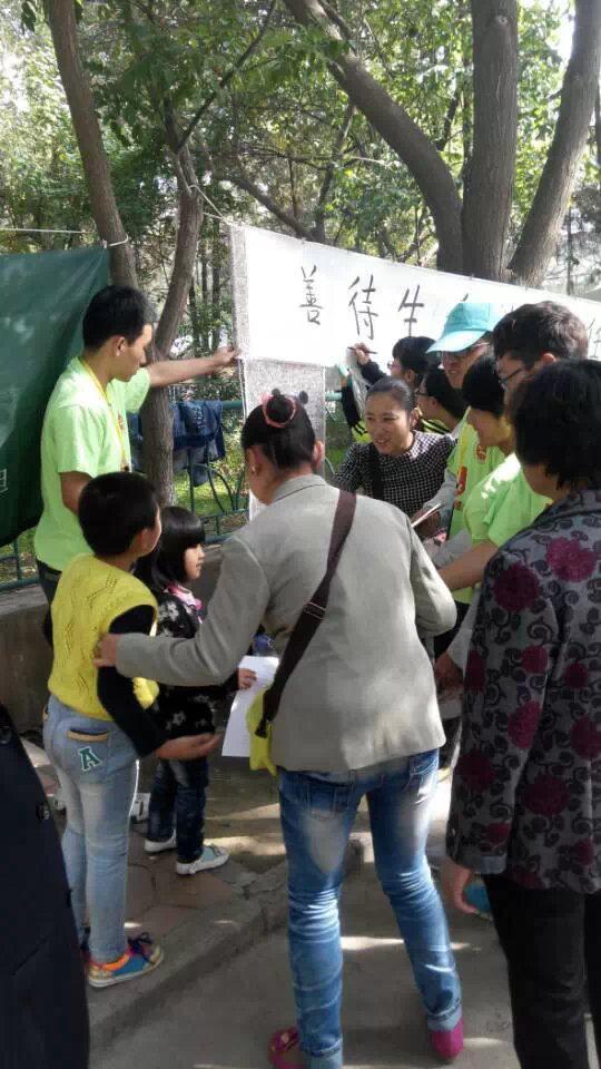 2014年10月2日,绿色环保志愿者协会在兰州市五泉山动物园参加了“我承诺:拒看动物表演!”、“善待生命 做负责任的猫狗宠物主人!”为主题的宣讲活动,我协会参加活动总人数11人。本次活动以“拒看动物表演”、“做负责人的猫狗宠物主人”为主题,活动主要分为两个阶段:第一阶段是通过面向路人展示介绍动物表演背后的血腥与残忍以及流浪猫狗的生活现状 ,并邀请路人合影留念、签名呼吁关爱保护;第二阶段是成果展示,全体所有活动人员同签名条幅及协会会旗合影留念,并组织清理活动现场。