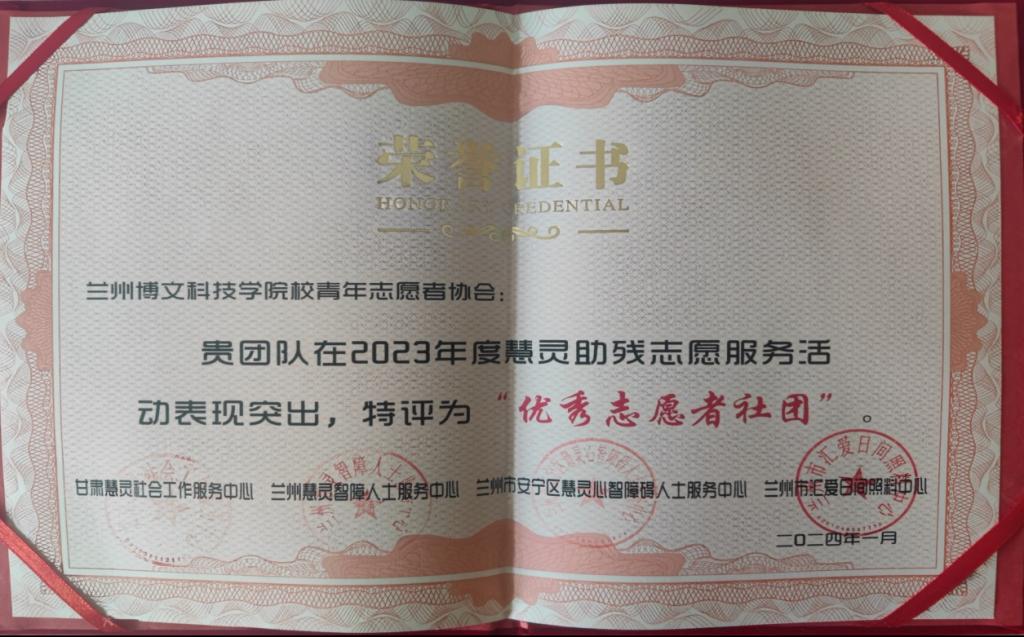 近日, 博文科技学院青年志愿者协会再次斩获殊荣,其在 2023 年度慧灵助残志愿服务活动中展现出卓越的志愿服务精神和引人注目的表现,因此荣获“优秀志愿者社团”称号。