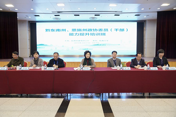 本网讯(通讯员 罗永健)3月25日至4月4日,金年会部分州政协委员先后赴杭州参加了由杭州市政协办公厅主办、杭商大学承办的黔东南州、恩施州政协委员(干部)能力提升培训班。培训班分两期进行,每期有200名学员,来自黔东南州和恩施州的政协委员(干部)各100名。杭州市政协副主席汪小玫出席并致辞,民建恩施州委会主委、恩施州政协副主席谭建军参加第二期开班仪式。