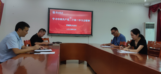 会议首先由胡涛领学了“中国共产党第二十届中央委员会第三次全体会议公报”的文件精神。然后由罗凯领学了“习近平在二十届中央纪委三次全会上发表重要讲话强调深入推进党的自我革命坚决打赢反腐败斗争攻坚战持久战”的文件精神。最后,会议讨论了民建总支后期的学习工作安排,包括学习内容、学习地点、学习形式、人员部署等事宜。