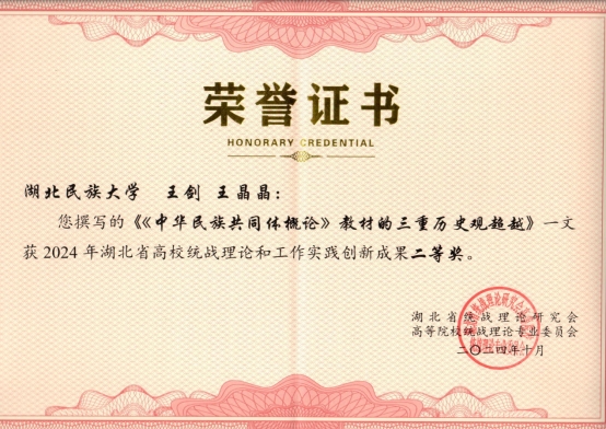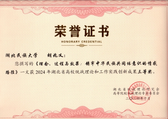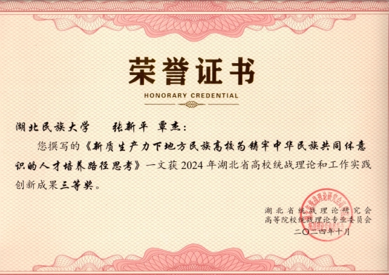 本次年会上,研究会表彰了4篇优秀调研报告、8个2024年度统战理论研究优秀组织单位以及86篇优秀论文。金年会教师提交的理论文章中有4篇获奖,王剑、王晶晶的《<中华民族共同体概论>教材的三重历史观超越》获二等奖;张新平、覃杰的《新质生产力下地方民族高校为铸牢中华民族共同体意识的人才培养路径思考》、李华霖的《以习近平文化思想为指导 推进中华民族共有精神家园建设》、胡兆义的《理念、过程与效果:铸牢中华民族共同体意识的情感路径》获三等奖。