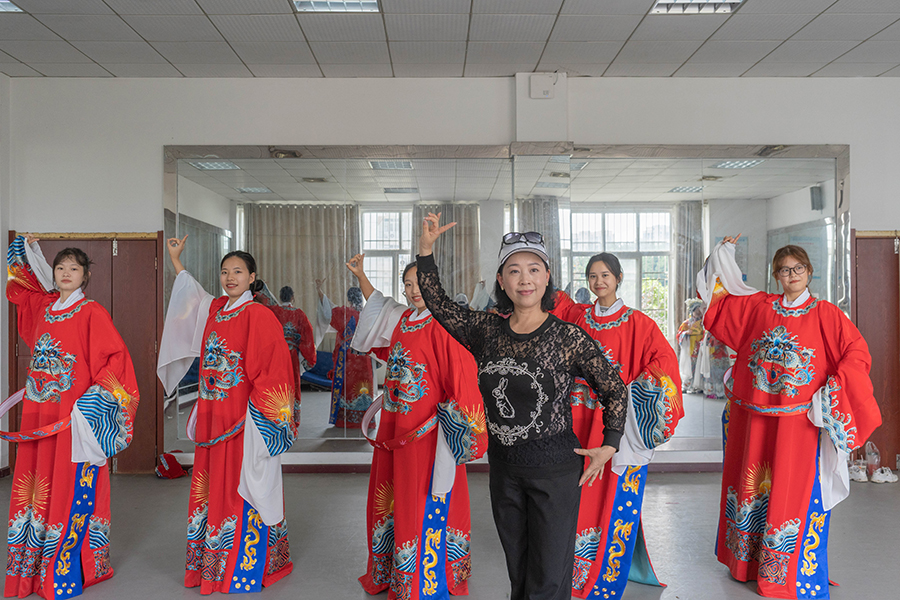 入校的第一年,正值湖北省举办校园戏曲展演与高校戏剧两项赛事。黄丽芬曾经有过学习戏曲的基础,便主动承担了此次赛事任务。戏曲是一门综合性的舞台表演艺术,与声乐和舞蹈相比,戏曲增加了更高的难度系数,何况是面对毫无戏曲表演基础的学生。在接下来的排练工作中,黄丽芬从最基本的动作开始,给零基础的学生们指导、排练。下课后,她有时沉浸在让学生学好戏曲的“手眼身法步”中,连休息喝口水都顾不上。时间的紧迫、密集的排练让黄丽芬的身体难免吃不消。即使伤痛在身,但在排练场上,她从未面露难色,努力调整到最好状态,细抠排练的每一个动作。