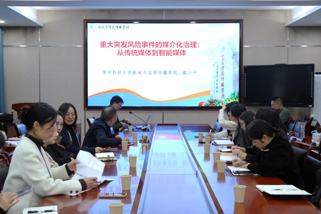 本网讯(文/张雨薇 彭思懿 图/贺鑫增) 10月21日上午,华中科技大学新闻与信息传播学院副院长、博士生导师郭小平教授在智慧一教室开展“重大突发风险事件的媒介化治理:从传统媒体到智能媒体”主题讲座,文传学院院长张宏树教授主持讲座。(讲座现场)郭小平教授立足于重大突发风险事件的媒介化治...