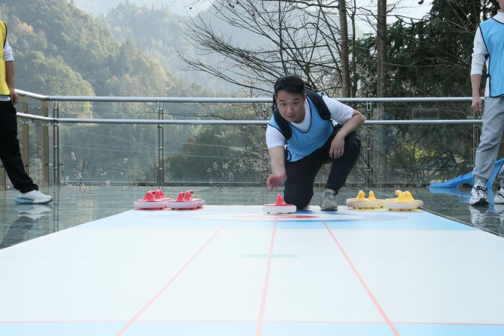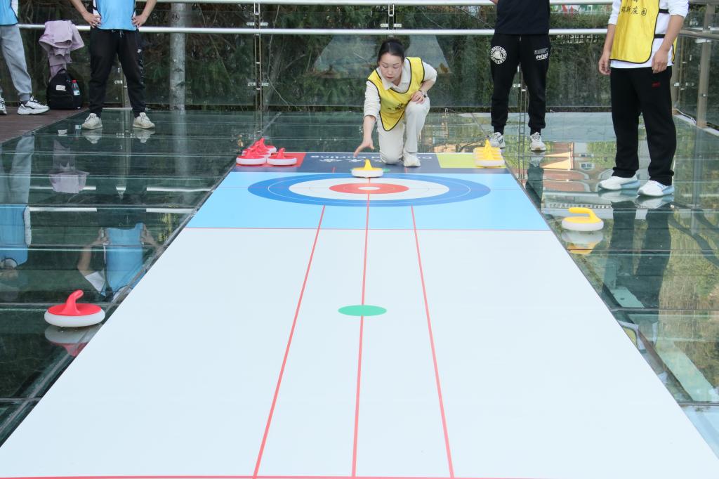在“旱地冰壶”竞技中,队员们全心地投入和认真的态度,赛出了风采,展现了英姿,掀起了阵阵高潮。