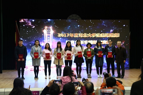 作为此次会议的重要议程,2017年度湖北大学生新闻传播教育创新实践技能竞赛颁奖仪式在主会场隆重举行。此项竞赛为湖北省教育厅2017年度全省高校大学生科技创新和技能竞赛项目,是我省唯一列入政府奖励的文科类专业学科赛事。经过两个月的严格评审,从全省35所高校选送的422件参赛作品中,分别产生了新闻采编类、广告类、播音主持类、学术论文类和微视频类大奖等五大类获奖成果。金年会文学与传媒学院通过周密组织、深入指导,共有10件学生创新成果作品获奖,其中获一等奖3项。