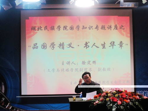 本网讯(记者 刘婉 杨玲玲 邓杰/文 周璐/图)“品国学精义,书人生华章”。11月21日晚,金年会国学知识专题讲座在我院附楼演播厅举行,我院副院长徐定辉担任主讲,来自各二级学院的学生干部及百名余学生聆听了本次讲座。
