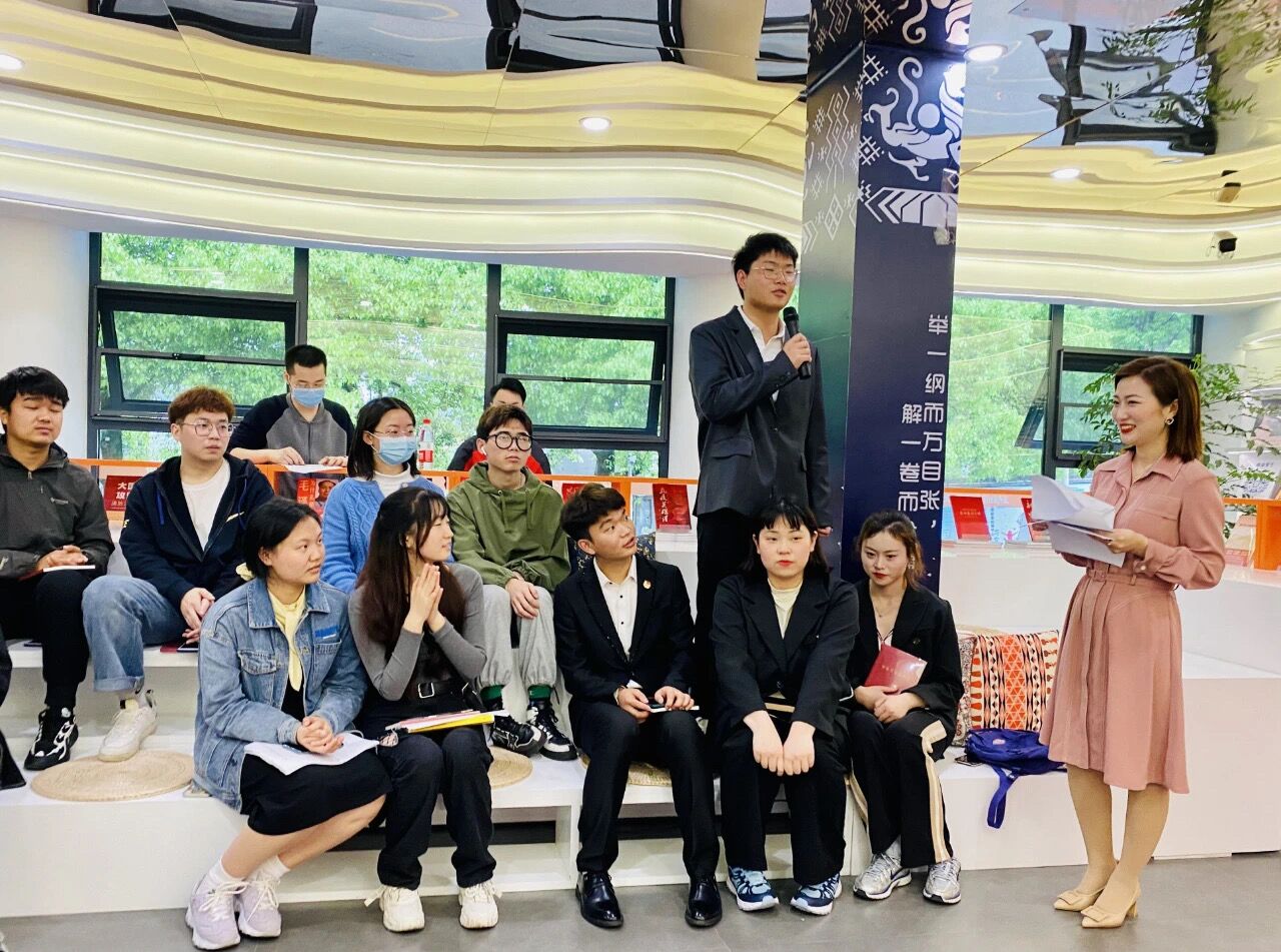 学生代表徐芙蓉从大学生的国家观、诵读经典以及活动的意义等方面展开,呼吁学生热爱党和国家,以阅读充实自己。党史问答环节,主持人从题库中随机抽取题目,学生踊跃回答。