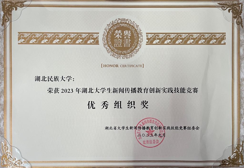 在2023湖北大学生新闻传播教育创新实践技能竞赛颁奖典礼上,文学与传媒学院通过精心组织选送的学生实践作品在赛事中再创佳绩,共获省级一等奖4项、二等奖4项,三等奖3项,位居全省高校前列,省属高校第一,jinnian金年会荣获2023湖北大学生新闻传播教育创新实践技能竞赛优秀组织奖。