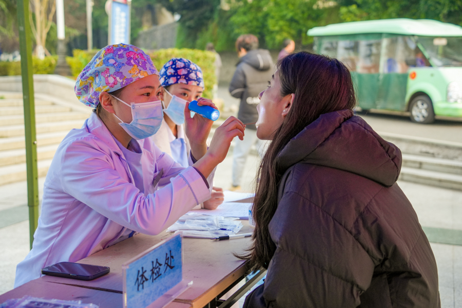 “呵护眼健康·一年一眼检”眼科义诊活动。眼科医生辅助检测者进行眼部放松训练,并通过电脑验光对检测者进行基础验光与散光度数计算。眼科医生通过要求检测者朗读视力表上字母或符号来测定检测者是否存在近视、远视、散光等屈光不正问题并针对性的给予了治疗意见。“口腔健康,全身检查”口腔义诊活动。口腔医生对检测者进行专业仔细的口腔健康检查、龋病防治、牙周防治等服务,为患者提供详细的解释和一系列有效的治疗方案。