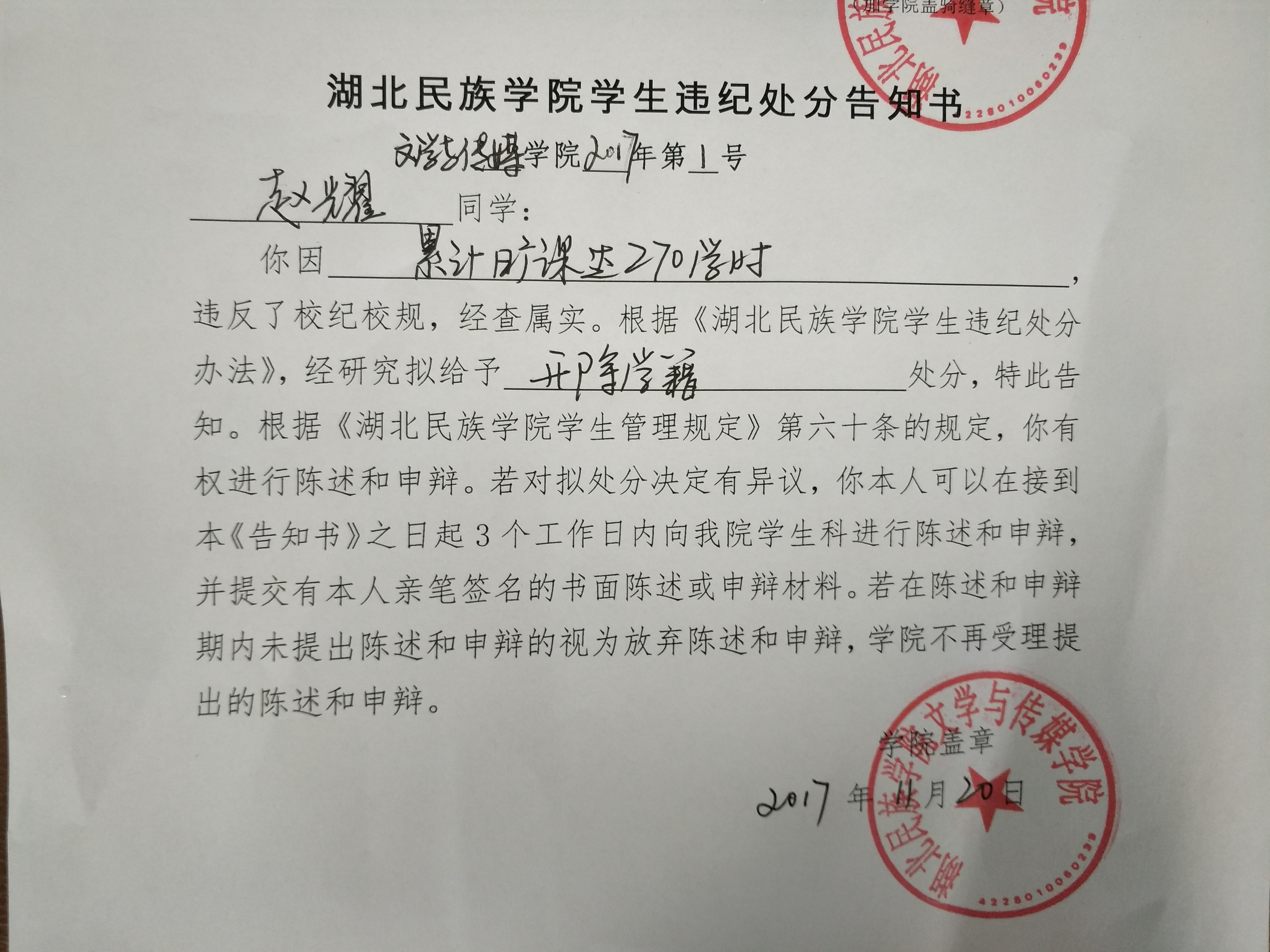 关于给予赵耀开除学籍处分的告知书