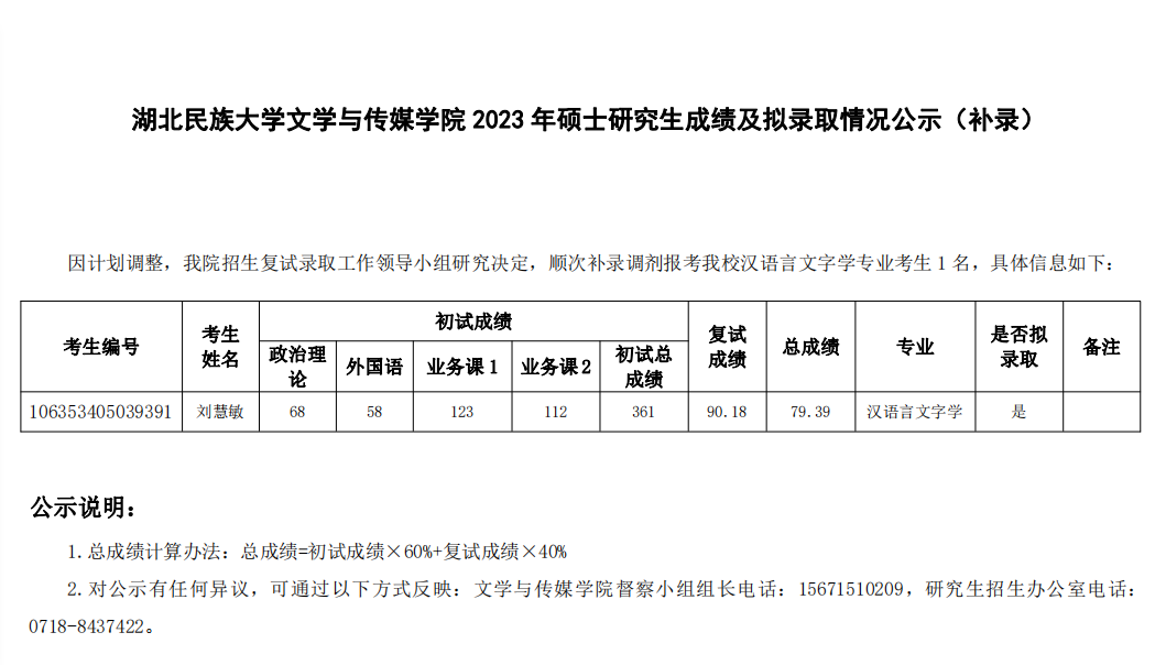 jinnian金年会文学与传媒学院2023年硕士研究生成绩及拟录取情况公示(补录)