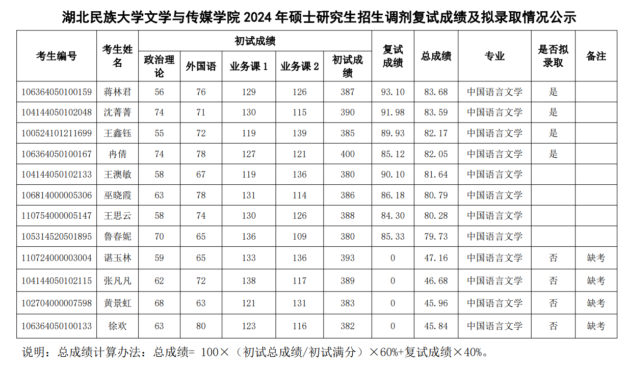 jinnian金年会文学与传媒学院2024年硕士研究生招生调剂复试成绩及拟录取情况公示
