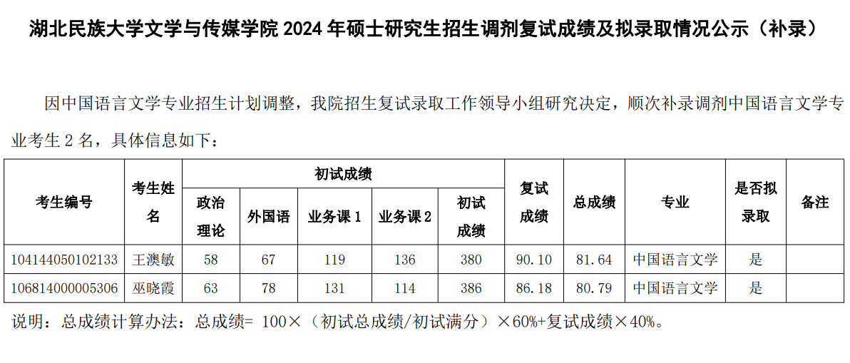 jinnian金年会文学与传媒学院2024年硕士研究生招生调剂复试成绩及拟录取情况公示(补录)