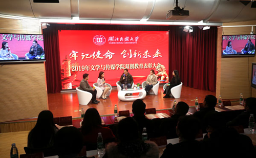 12月15日晚,文学与传媒学院在演播厅隆重举行“牢记使命 创新未来”2019年度双创教育表彰大会。学校党委委员、宣传部常务副部长唐敦双,教务处处长谭世明,科技学院院长廖云,教务处副处长谭华和创新创业教育学院副院长易金桥出席了表彰大会,并为相关学科赛事的获奖师生颁奖。