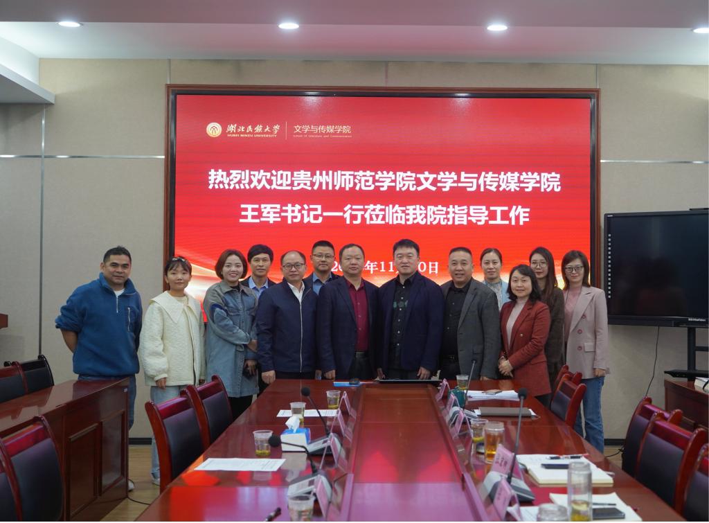 本网讯(通讯员 周琳)11月10日,贵州师范学院文学与传媒学院党委书记王军一行来我院就学科、专业、硕士点建设进行交流。我院党委书记张刚,院长张宏树,党委副书记李御娇,副院长刘进华、江佳慧及相关科室、专业负责人参与交流。我院院长张宏树主持交流会。 (座谈会现场)交流会上,张宏树代表学...