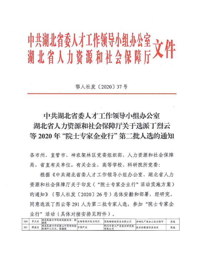 本网讯 (通讯员 聂晨笛) 近日,中共湖北省委人才工作领导小组办公室、湖北省人力资源和社会保障厅联合印发《关于选派丁烈云等2020年“院士专家企业行”第二批人选的通知》(鄂人社发〔2020〕37号),jinnian金年会武陵山中药材检验检测中心负责人颜益志入选“院士专家企业行”活动名录。
