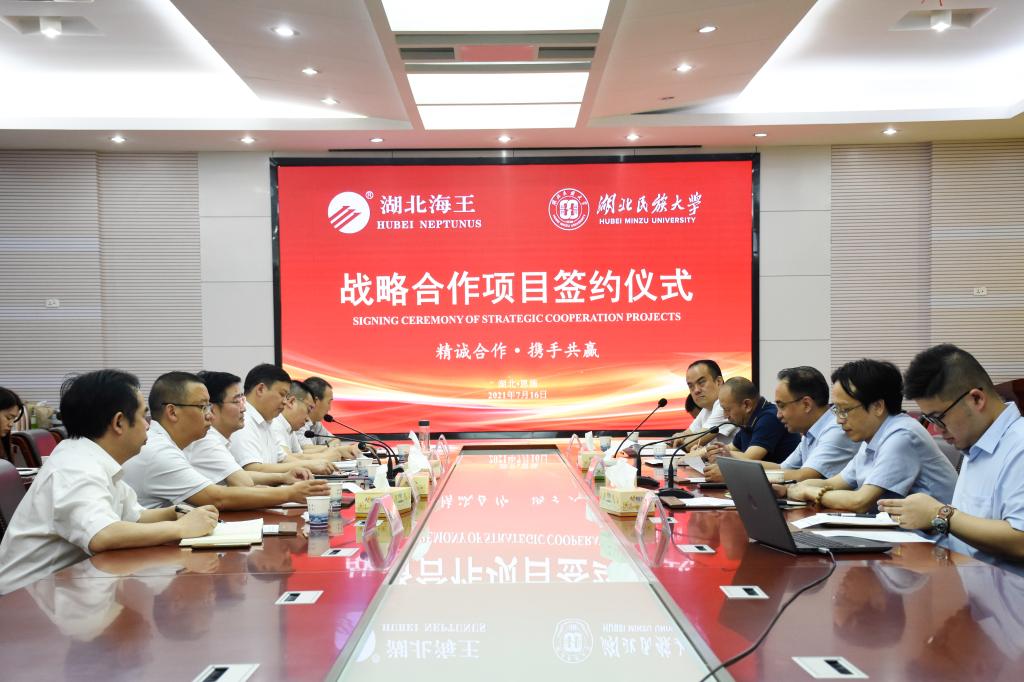 邓磊、张凡代表双方在战略合作协议书上签字。颜益志代表学校领受“湖北海王医药集团有限公司中医药产业研发基地”匾牌。