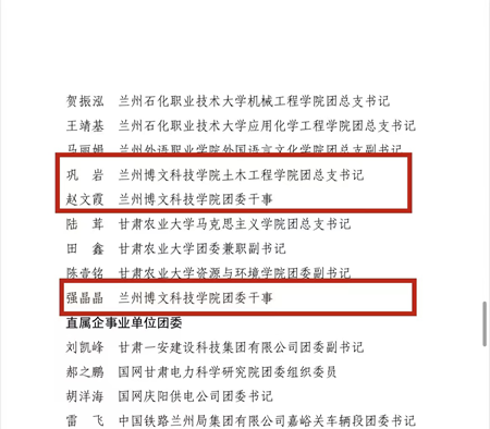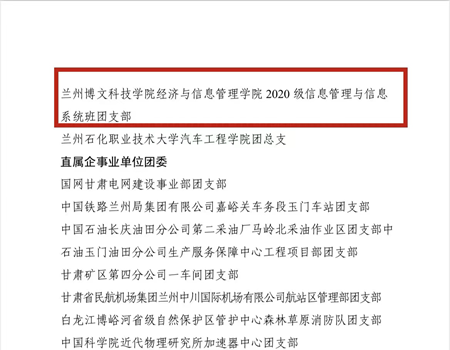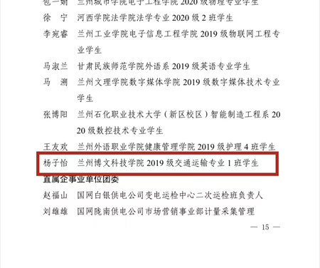 2021 年,全省各级团组织坚持以习近平新时代中国特色社会主义思想为指导,深入学习贯彻习近平总书记关于青年工作的重要思想以及对甘肃重要讲话和指示精神,主动担当尽责,开拓创新实干,有序推进共青团深化改革和全面从严治团,在党和人民最需要的急难险重新任务中勇挑重担,冲锋在前,充分发挥了生力军和突击队作用,团的事业实现了新发展,各条战线涌现出了一批先进典型。在“五四青年节”来临之际,甘肃省人力资源和社会保障厅和共青团甘肃省委为总结经验、表彰先进,授予全省多个集体及个人荣誉表彰,我校个集体及4名师生荣获表彰。
