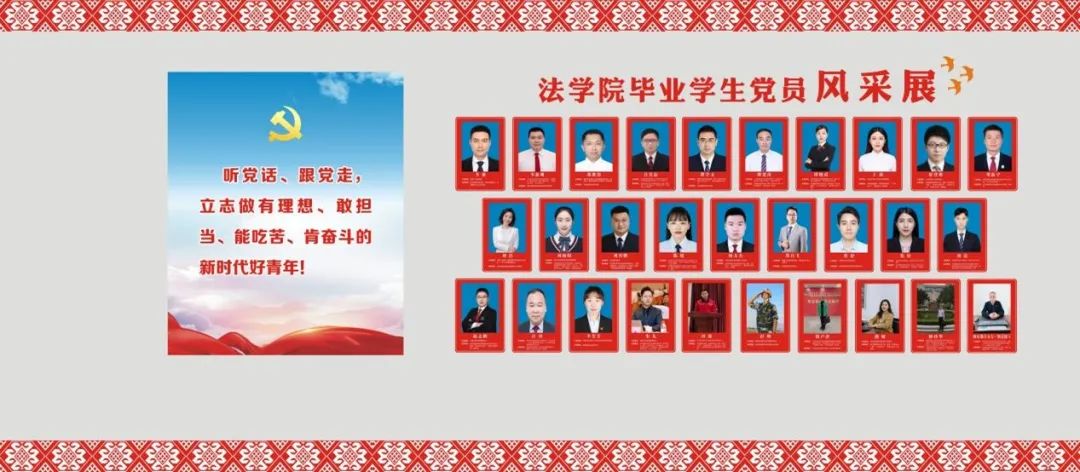 说明:发挥环境思政育人功效,选取29位来自全国各地的优秀毕业生党员典型,用他们的先进事迹来激励在校青年向榜样学习。例如,荣获“全国司法行政系统先进工作者”“湖北青年五四奖章”的乡镇司法所所长陈娟,以引导更多大学生成为社区治理的好助手、主力军。
