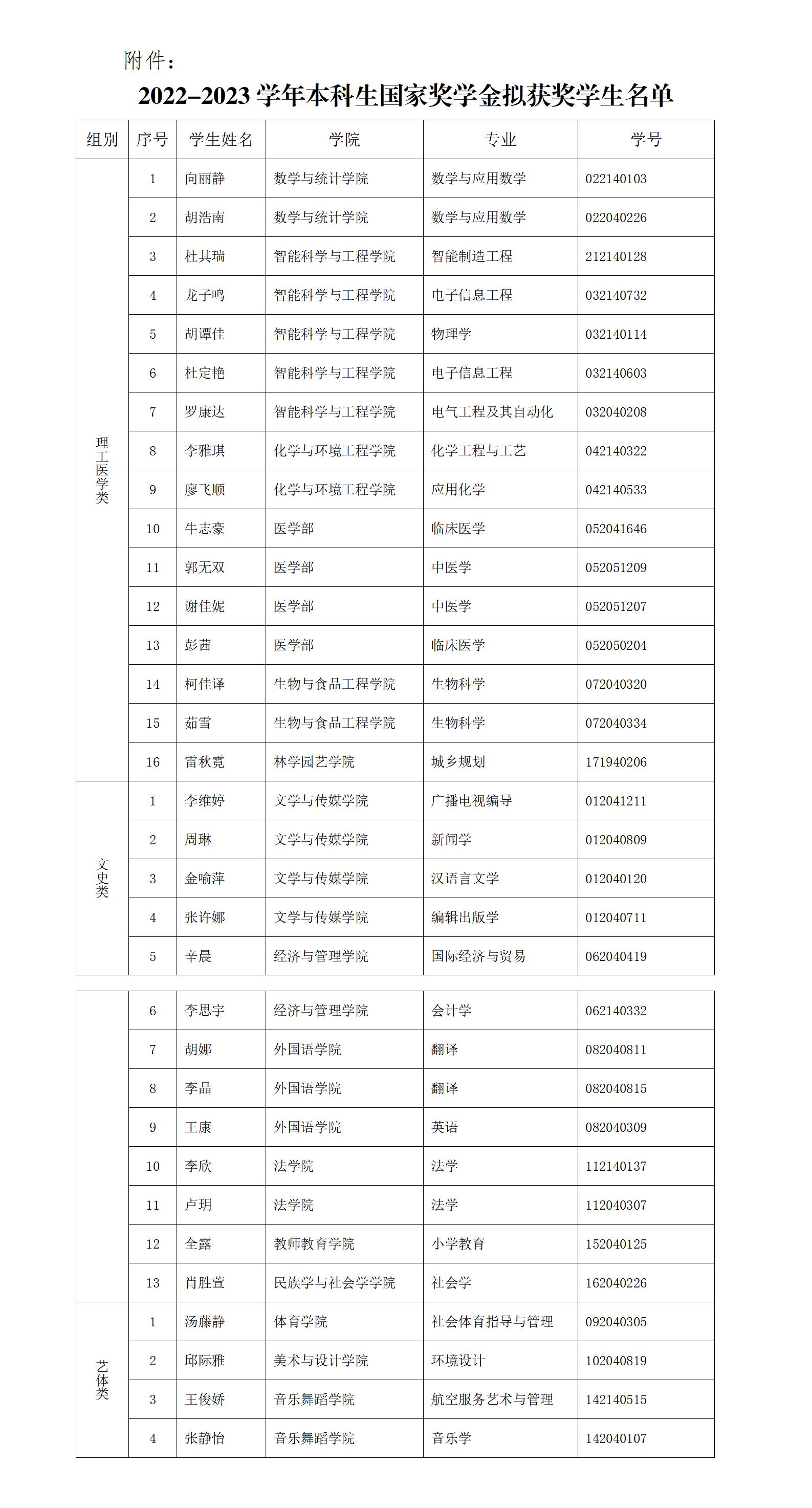 根据《湖北省学生资助管理中心关于做好2022-2023学年本专科生国家奖学金初评工作的通知》、《jinnian金年会本科学生国家奖学金实施细则》(民大校办发〔2020〕67号)、《jinnian金年会关于开展2022-2023学年国家奖学金评审暨国家奖学金答辩评审会的通知》等文件精神,经各学院(部)初评推荐、学生工作处组织答辩评审,拟确定柯佳译等33名学生为金年会2022-2023学年本科生国家奖学金获得者,现公示如下,名单附后。