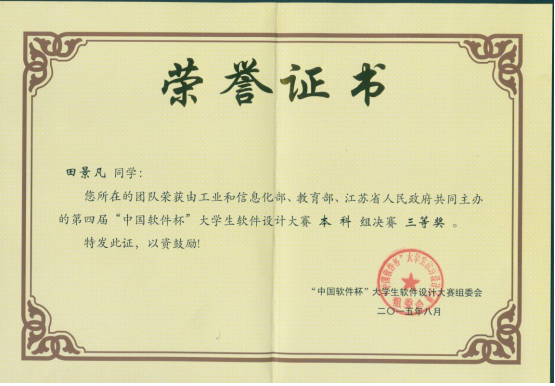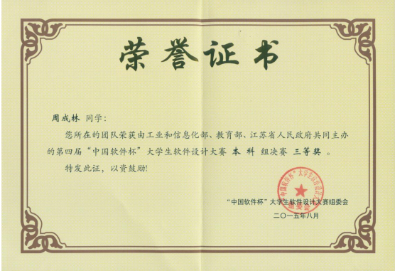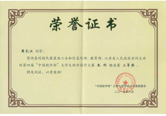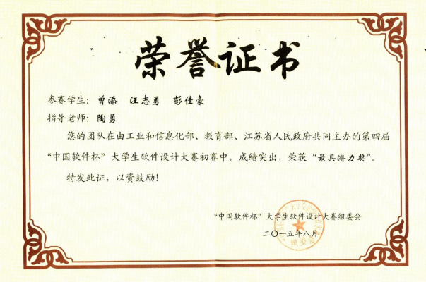 在2012年信息工程学院计算机科学与技术专业部分学生参加第一届中国“软件杯”大赛,2013年组织参加了第二届中国软件杯,并获得了全国二等奖的成绩。在总结前两届比赛结果的基础上,通过总结上次比赛经验的不足,认真做好各项赛前工作,并于2015年4月份组织部分指导教师及学生参加了第四届中国“软件杯”大学生软件设计大赛。本次比赛信息技术创新中心经过两个多月的认真准备、选拔、培训及指导,最终在6月30日前成功提交5件作品。经过参赛师生的共同努力,在总结上次比赛失败教训的基础上,在全国500多所高等院校2000多件件参赛作品当中,金年会最终有1件作品成功入围现场决赛。8月17-20日在南京航空航天大学举行的第四届中国“软件杯”大赛现场决赛中,经过现场展示、综合评审与答辩评审三个环节,金年会参赛选手杜周成林、田景凡、黄长江等3名同学的作品“比特能机器人”得到了全场评委专家的一致好评,最终荣获了全国三等奖。其他三支参赛队的作品在现场表现也不错,获得了“优胜奖”等奖项。