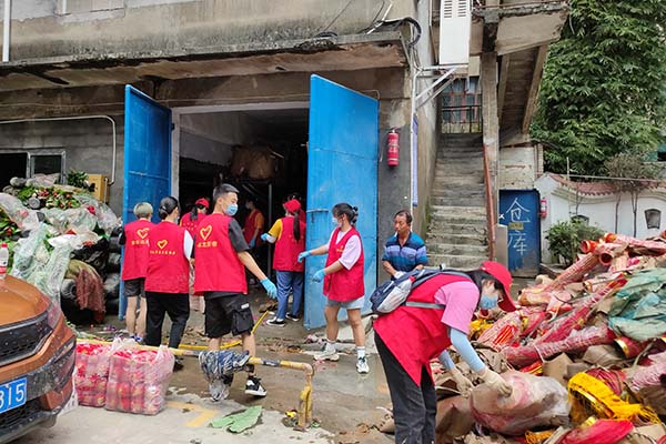 金年会青年志愿者清理一楼店铺被水浸泡过的物品